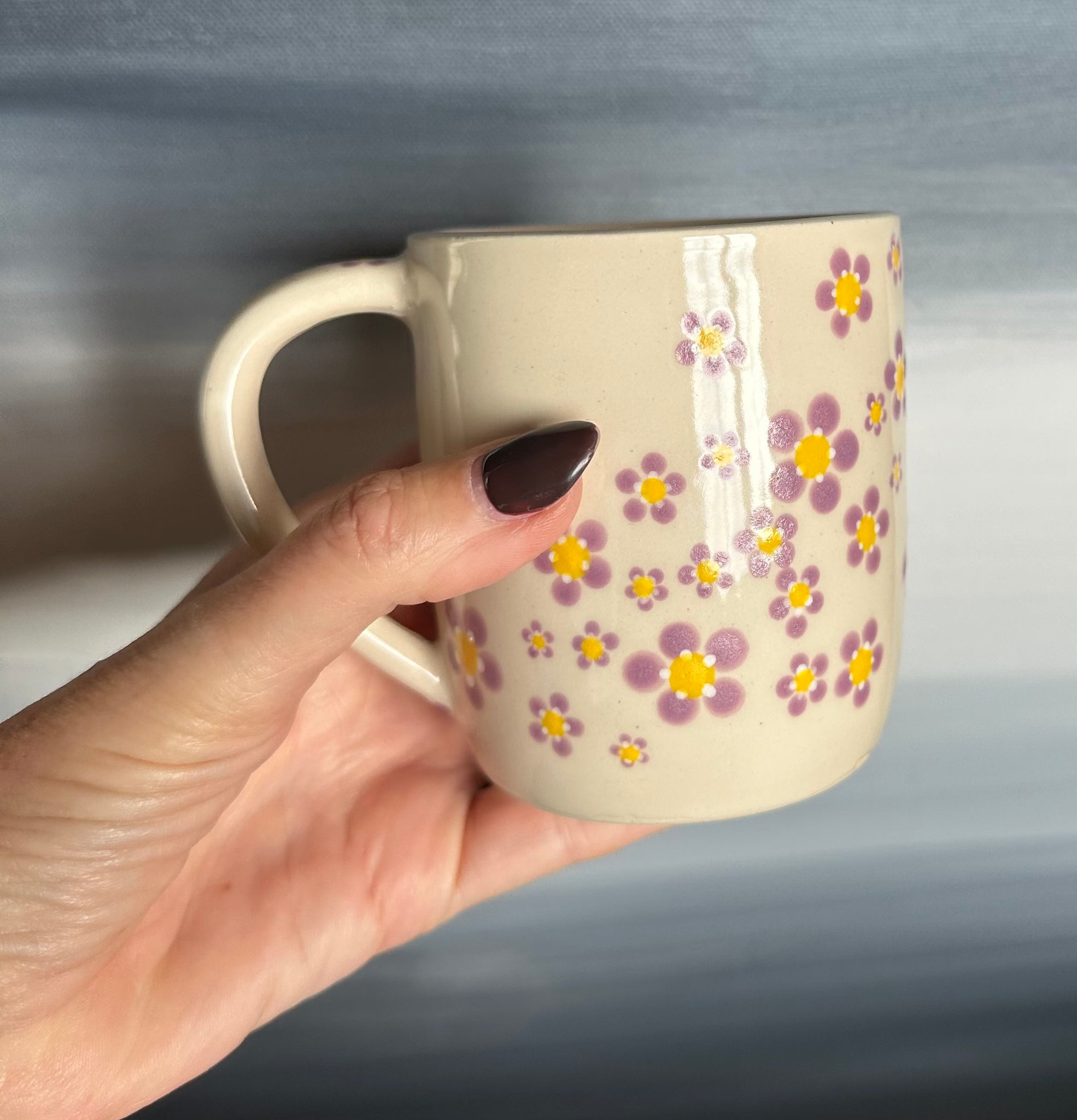 A selection of individually hand-crafted mugs with flowers, dots and splashes - each mug is unique. Hand-crafted by Victoria Davis and then decorated by me - these mugs are then finished with a clear glaze.